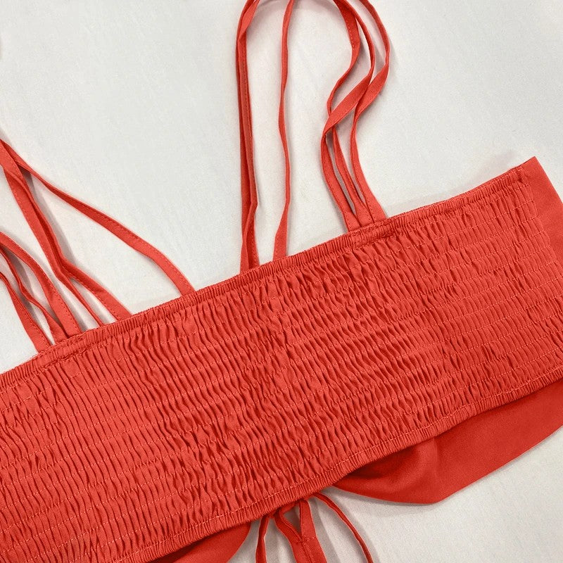 Vestido feminino longo, sem mangas e sem costas, alças finas, detalhe rendado com amarração, plissado